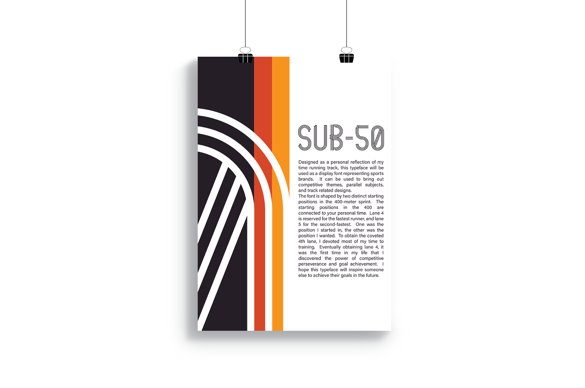 I designed a new typeface inspired by a personal theme: Track and Field. Named after my goal to achieve a sub-fifty-second time in the 400-meter race—a milestone I surpassed by over two seconds before the end of my running career—the typeface embodies the concept of self-improvement.